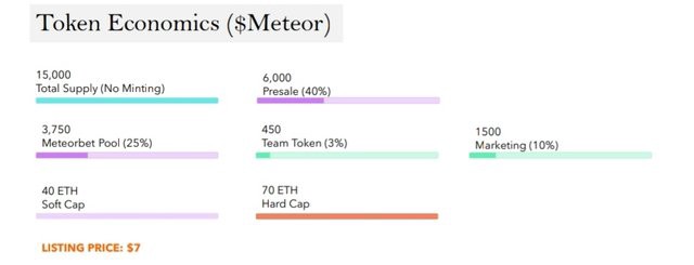 ECONOMIC FROM COINS ($ METEOR) 15,000 TOTAL SUPPLY (WITHOUT COINING) 6,000 PRE-SALES (40%) 3,750METEORBET POOL (25%) 450Token OF TEAM (3%) 1500 MARKETING (10%) 40 SOFT ETHTOPY70 HARD ETHTOPI
